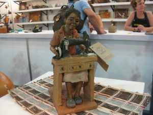 Acima uma escultura em cerâmica de uma costureira... linda! Obra de um artesão participante da Sutaco, Superintendência do Trabalho Artesanal das Comunidades, de São Paulo/SP.