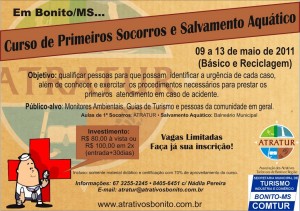 Com o intuito de proporcionar o melhor atendimento e segurança a todos que visitam Bonito/MS, a Associação dos Atrativos TurÃsticos de Bonito e Região - ATRATUR, realizará em Bonito/MS de 09 a 13 de maio de 2011 a 11ª edição do Curso de Primeiros Socorros e Salvamento Aquático, em parceria com o Corpo de Bombeiros de MS e Secretaria de Turismo de Bonito.