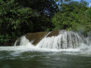 para fazer um passeio de "duck" (uma espécie de caiaque inflável) no Rio Formoso, subindo em direção a "cachoeira do Postal". Conhecida por esse nome porque sua imagem foi usada em um dos primeiros cartões postais de Bonito a serem comercializados.O trecho de remo foi pequeno mas já nos cansou um pouco - afinal remamos aproximadamente 3 horas, somando a ida e a volta, das 15h às 18h. Nossa sorte é que o sol não estava tão forte e a temperatura estava agradável, do contrário talvez não tivesse sido tão bacana....