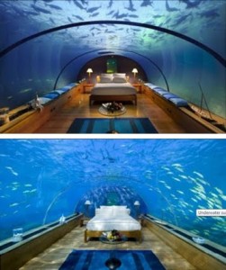 3º Hotel Conrad â nas Ilhas Maldivas, oferece uma suÃte sob o Oceano Ãndico para seus hóspedes. Com o teto e as paredes de vidro, o quarto permite ver os peixes em seu ambiente natural por todos os lados. Os proprietários, no quinto aniversário do empreendimento, resolveram transformar o espaço num quarto destinado aos recém-casados, proporcionando uma lua de mel inesquecÃvel, oferecendo uma noite com peixes e um café da manhã com champagne.