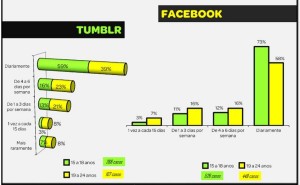 Acima vemos como estão divididas as frequências de acesso às redes sociais Tumblr e Facebook. Me chamou a atenção o fato de os mais jovens (15 a 18 anos) serem mais frequentes no Fecebook que os de mais idade (19 a 24 anos). Eu tinha uma imagem diferente do Facebook, imaginava que a rede fosse utilizada com mais frequência pelos mais velhos.