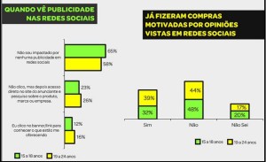 Interessante observar que os resultados da pesquisa apontam que para este público (jovens) a publicidade em redes sociais não promove grande impactos na decisão de compra de produtos ou serviços, ao passo que uma boa parte já se decidiu por comprar algo por influencia de opiniões vista nas redes sociais, conforme pode-se ver abaixo.