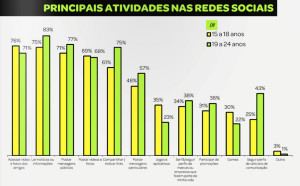 Com relação à s principais atividades nas redes sociais, a galera mais jovem utiliza a rede preferencialmente para "acessar vÃdeos e fotos dos amigos" (76%), "ler notÃcias ou informações" (75%) e para "postar mensagens públicas" (71%). Já os mais velhos utilizam a rede principalmente para "ler notÃcias ou informações" (83%), "postar mensagens públicas" (77%) e "compartilhar e indicar links" (75%) conforme podemos observar na imagem acima.