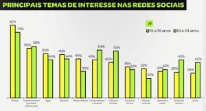 Sobre o principal interesse desse público nas redes sociais destaca-se a "música", seguido pelo "entretenimento" nas duas faixas etárias examinadas. importante então, se sua intenção for atingir este público, que seu produto ou serviço esteja linkado com esses temas. Vejam na imagem acima como se distribui o interesse do público estudado pelos diversos temas.
