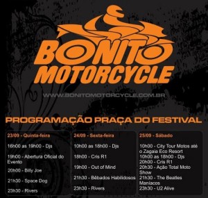 Bonito, mais uma vez sediará um evento, o Motorcycle, é um encontro de motociclistas, que começa hoje dia 23 de setembro e termina no dia 26, com várias apresentações artÃsticas, abrilhantando e fortalecendo o segmento de Eventos no municÃpio.