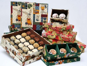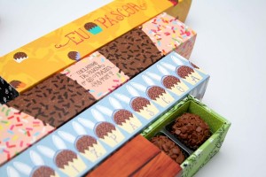 Acima, as caixinhas de brigadeiro da Brigaderia, com motivos pascoalinos...