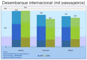 Em março, 529.671 passageiros desembarcaram no Brasil em voos regulares e não regulares vindos do exterior. O resultado é 4,5% maior em relação ao mês passado. No primeiro trimestre deste ano foram 1,7 milhão de desembarques contra 1,8 milhão no mesmo perÃÂodo de 2008. Os dados são da Infraero e levam em conta estrangeiros que entram no Brasil e brasileiros em retorno ao paÃÂs.