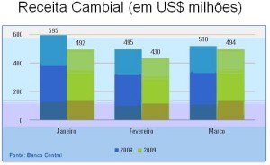 Os turistas estrangeiros deixaram US$ 494 milhões no Brasil em março de 2009. É o melhor resultado deste ano, segundo o Banco Central, com aumento de 14% em relação ao mês passado (US$ 430 milhões). No primeiro trimestre de 2009 foi registrada a entrada de US$ 1,46 bilhão. Menor do que no mesmo perÃÂodo de 2008, quando o gasto de turistas estrangeiros em cartões de crédito internacional chegou a US$ 1,6 bilhão.Fonte: Informativo Dados & Fatos - Ministério do Turismo - Março de 2009 - Ano 2 n.º 4