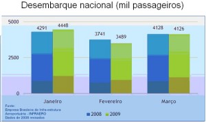 Em março, 4,12 milhões passageiros desembarcaram de vôos domésticos no paÃÂs. O resultado é 4,5% maior em relação ao mês passado, quando a movimentação nos aeroportos brasileiros chegou a 3,48 milhões. No primeiro trimestre deste ano foram 12 milhões de desembarques, contra 12,16 milhões no mesmo perÃÂodo de 2008. Os dados são da Infraero.